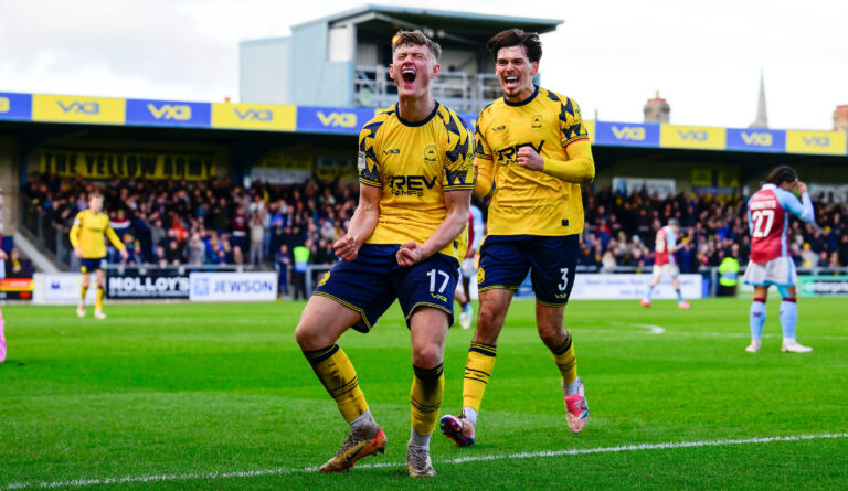 Goalscorers Dan Hayfield and Sonny Fish react to United’s 2-1 win over Chesham United at Plainmoor.