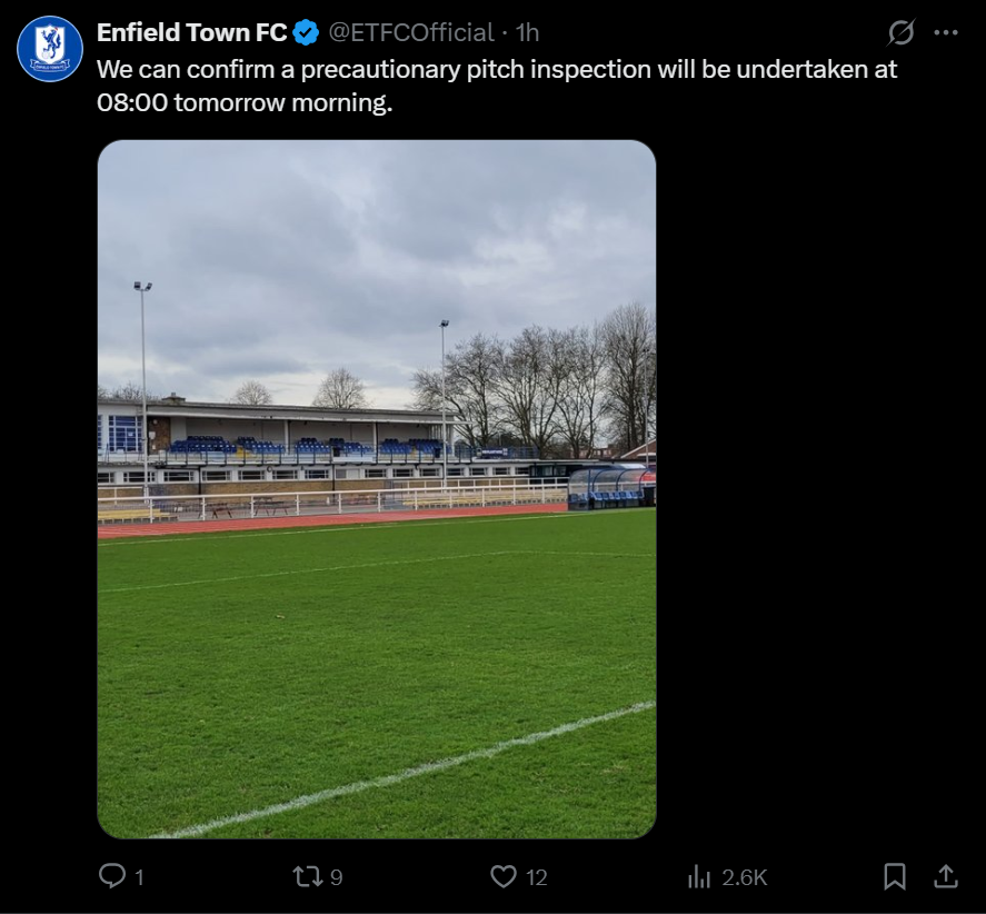 Enfield Town FC have posted the following update regarding Saturday’s fixture.