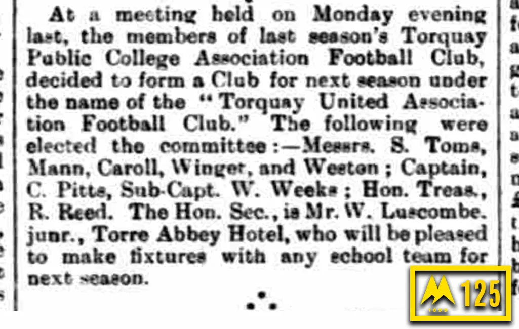 On Monday 1st May 1899, Torquay United Football Club was born.