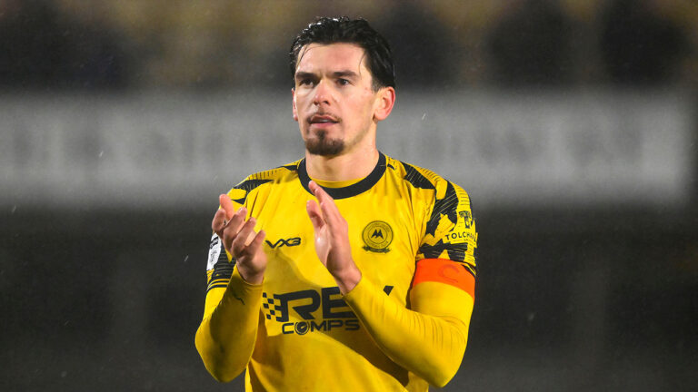 Captain for the game Jay Foulston reacts to United’s 2-1 victory over Salisbury at Plainmoor.
