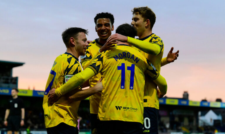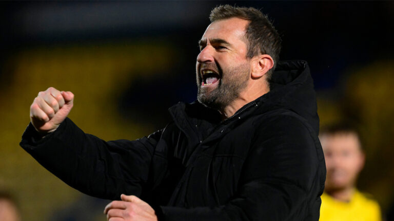 Manager Paul Wotton reacts to United’s 3-2 victory over Worthing at Plainmoor.