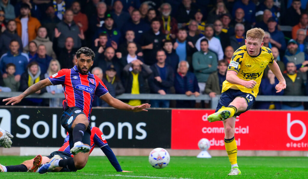 Tom Owen-Evans scores in The Bluebird’s 1-1 draw at home to Dover Athletic.