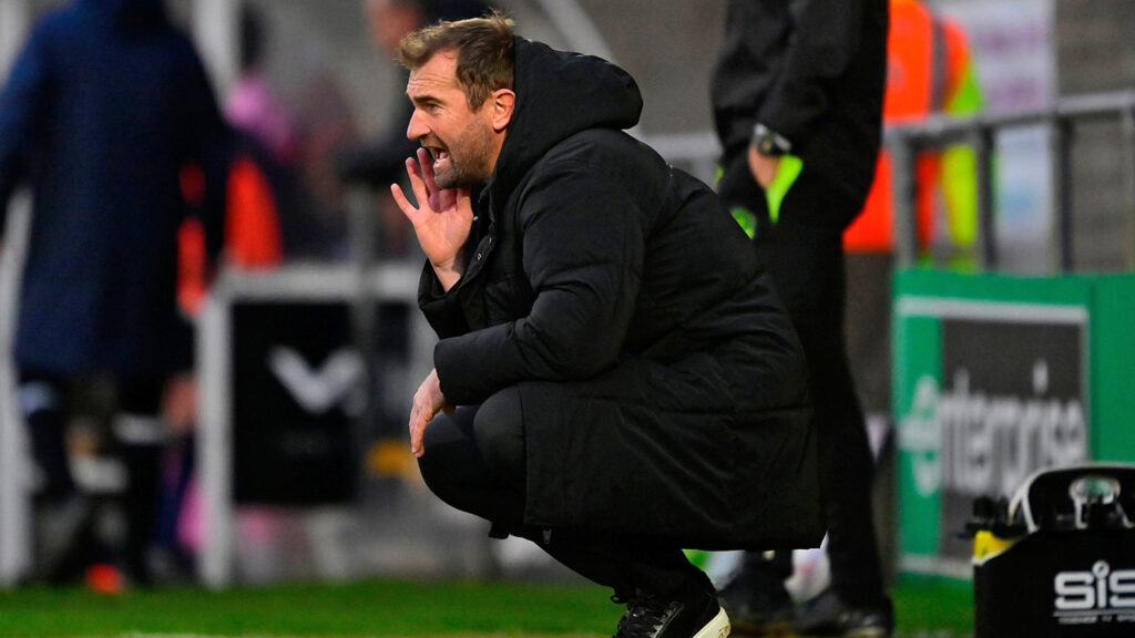 Manager Paul Wotton reacts to United’s 7-0 victory over Eastbourne Borough at Plainmoor.