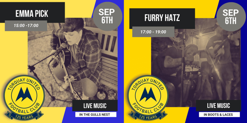 With post-match live music very much an essential part of the new matchday experience at Plainmoor this season, there will be two more top-class live acts entertaining supporters in The Gulls Nest (5pm-7pm)and Boots & Laces (7pm-9pm) on Saturday, with all supporters welcome!