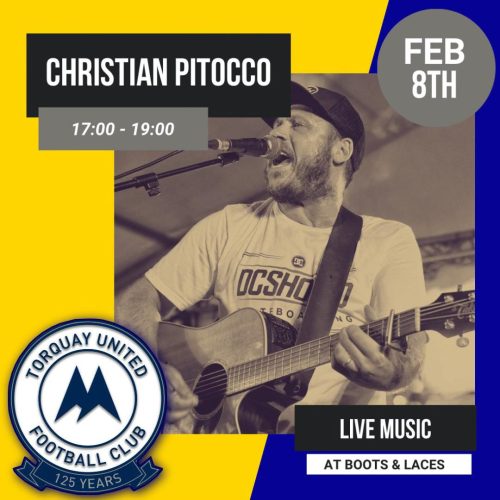 The recent addition of post-match live music at Plainmoor has already proven to be a big hit with the Yellow Army so far this season, and this Saturday, there will be another top-class live act performing after the full-time whistle, as supporters will be treated to the sounds of Christian Pitocco in Boots & Laces from 5pm-7pm!