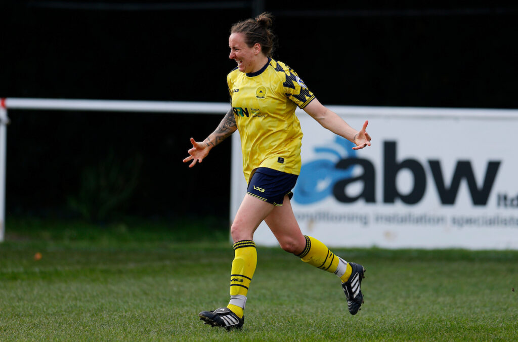 Goal celebrations for Tee Kaptein of Torquay United Women to level the score during the South West Regional Women's Football League match between Torquay United Women and Forest Green Rovers Women  at The Rec, Newton Abbot on 22 March 2026 (Photo: George Manning/PPAUK)