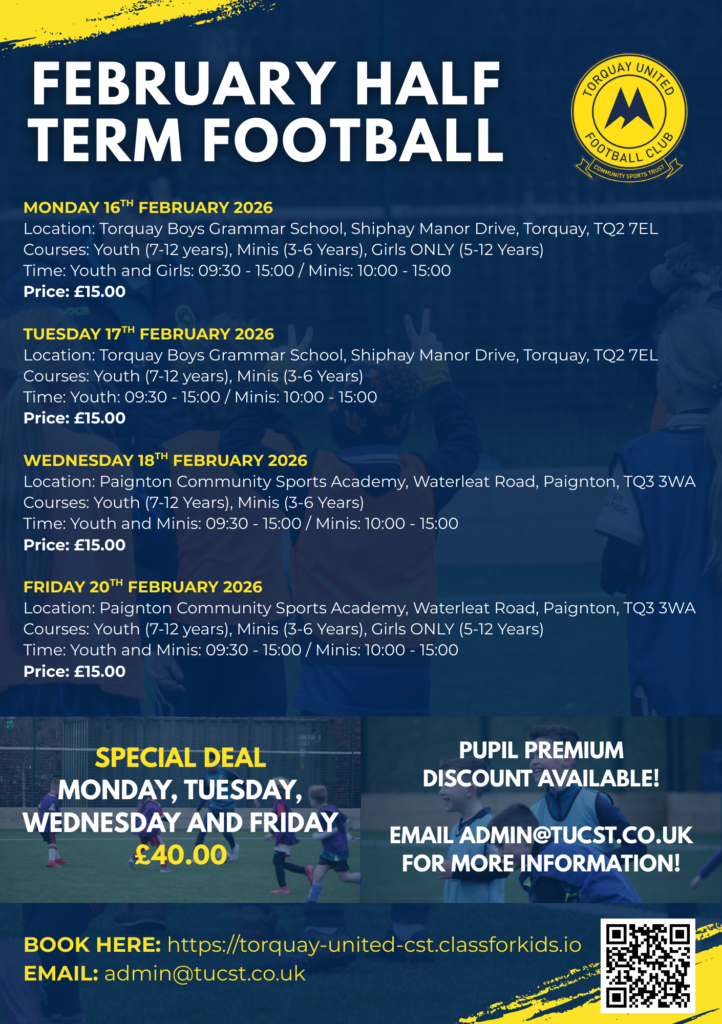Torquay United Community Sports Trust are running a 24-hour flash competition, with the prize being a four-day Holiday Course to be used during February half-term!